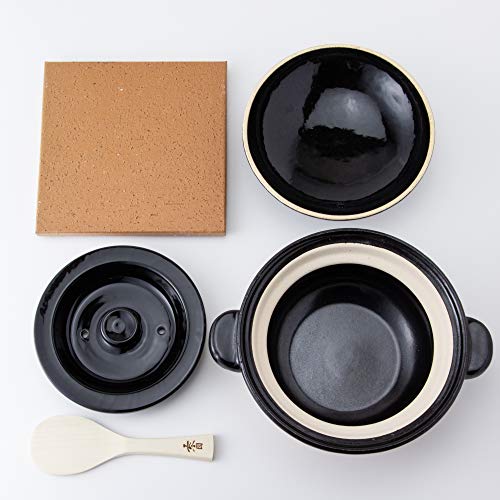 Kamado-san donabe/rice cooker from Iga-mono in Japan. This is a clay pot used for cooking rice the traditional way. The pot measures 8.25″ in diameter and 4″ high. The total height is 6.75″. Included is a trivet and wooden rice spoon. Capacity is 33 fluid ounces. This can be used over an open flame or in the oven. Should not be put in the dishwasher or microwave.