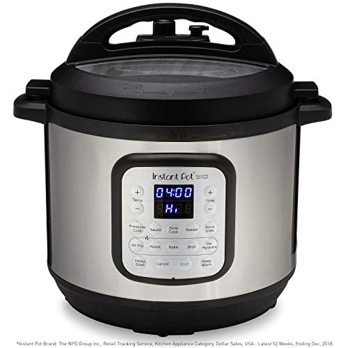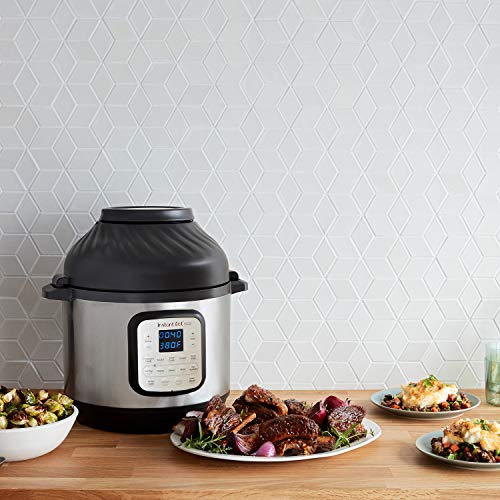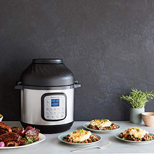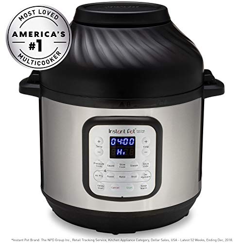 The Instant Pot Duo Crisp + Air Fryer is the best of all possible worlds. With 11-in-1 functionality, It does everything a regular Instant Pot does. But swap out the pressure cooker lid for the innovative air fryer lid, and you’ve got a whole new set of cooking techniques available — all fast, easy and at the touch of a button. The pressure cooker lid offers 6 wet cooking functions to quickly pressure cook, sauté, steam, slow cook, sous vide and warm. The air fryer lid offers 5 dry cooking functions to quickly air fry, roast, bake, broil and dehydrate. Pressure cooking and air frying both help you save time and cook healthy meals, while roasting and baking with the air fryer lid produces amazing results — without using a lot of energy or heating up your kitchen. Now you can make perfect chicken wings, crispy french fries and onion rings, battered fried vegetables and more The healthy way. The Instant Pot Smart programs make it fun and easy for anyone — from novice to chef — to prepare great healthy meals fast. And the bright displays, easy-to-use controls and easy-to-read icons that indicate cooking status make selecting programs, and making adjustments simple — even during cooking. Customize the time and temperature selects for total control and save your presets so your favorite meals can be made the way you like them. The delay start function ensures dinner is ready when you want it to be, and not before. Cleanup is easy too. Sleek surfaces wipe clean. And the pot, drip pan, cooking tray and basket are all dishwasher safe. Combine space-saving efficiency on your countertop with versatility and say goodbye to your microwave, toaster, slow-cooker, dehydrator and more. This multi-tasking, time-saving, space-saving Instant Pot appliance does it all.